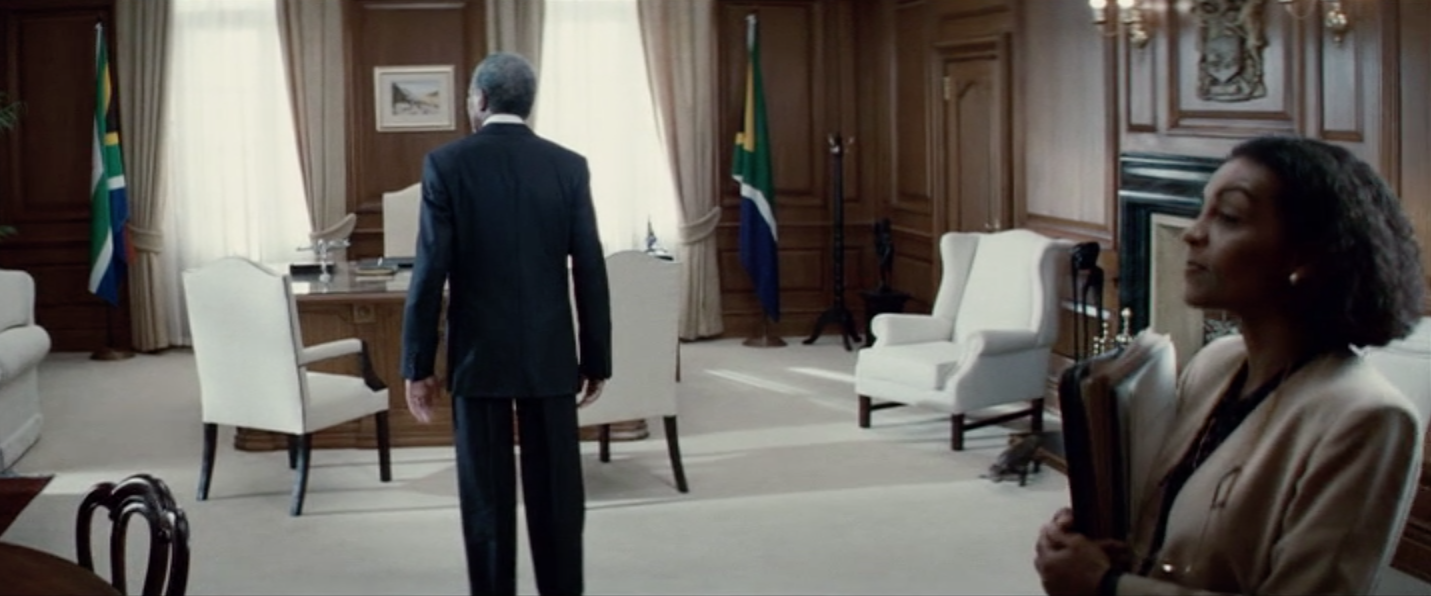Als hij in het kantoor aankomt, gebeurt er iets opvallends. Er moeten heel veel praktische zaken geregeld worden, maar Mandela wil eerst een moment alleen zijn en niet gestoord worden. Je ziet hem op de rug gefilmd rondkijken in het ruime en chique presidentiële kantoor. In de traagheid en stilte van dat moment komen verleden en toekomst tastbaar bij elkaar en besef je ook als toeschouwer dat er een nieuw avontuur start: voor Zuid Afrika, maar zeker voor Mandela zelf, die zich op dat ogenblik ten volle bewust wordt van zijn verantwoordelijkheid als president.