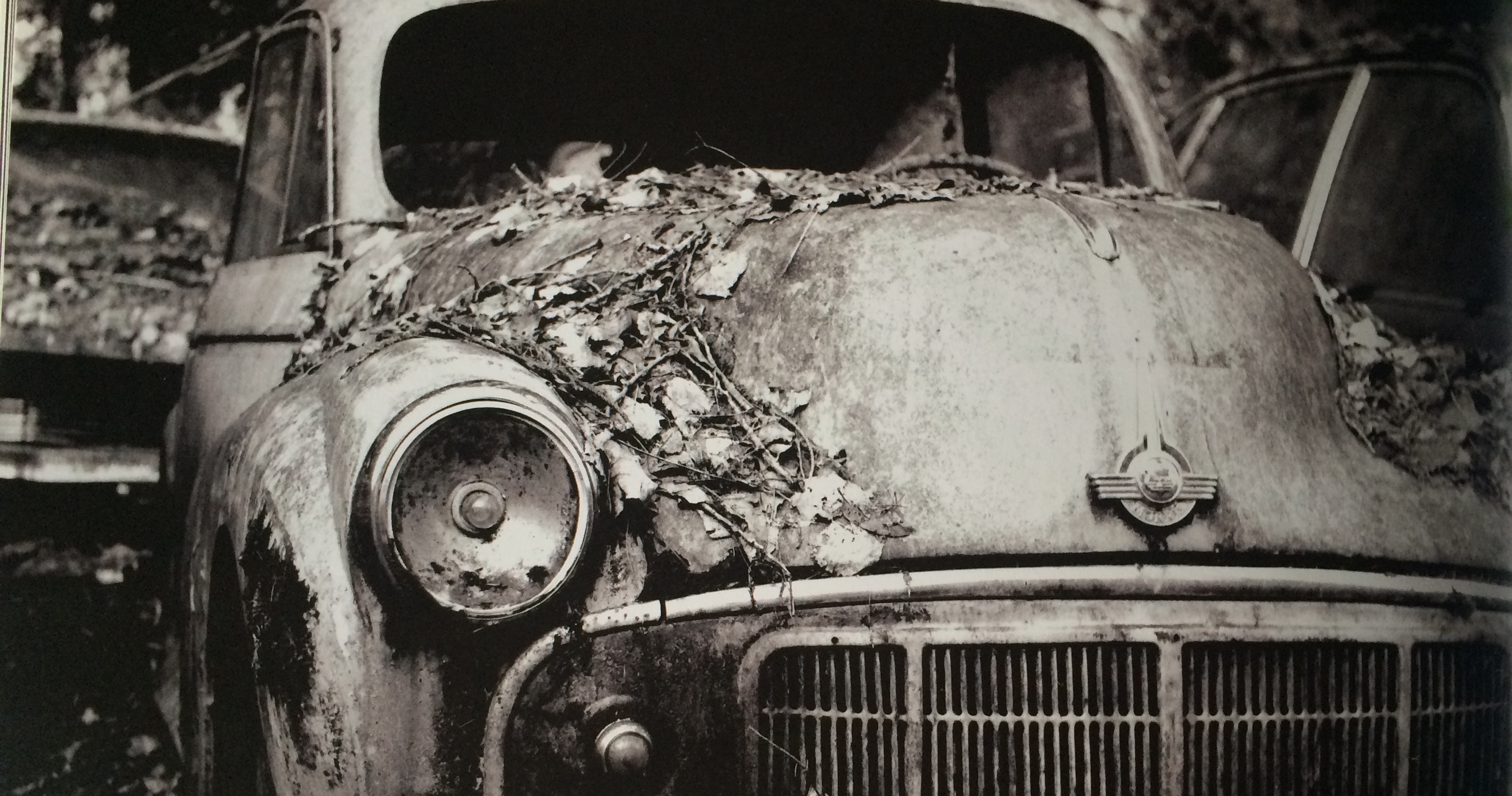 Onlangs kreeg ik het fotoboek ‘Park’ cadeau. Dit boek uit 2008, dat gemaakt is door de fotograaf Olivier Jeannin en de graficus Hervé Stadelmann, gaat over het autokerkhof van het Zwitserse plaatsje Kaufdorf. Dit autokerkhof onderscheidt zich van andere, omdat het vol staat met wagens van vóór 1970: Plymouth, Chevrolet, Oldsmobil, Austin, Studebaker, Peugeot, Ford etc.. Het zijn echter niet alleen de historische auto’s die het kerkhof bijzonder maken. Doordat er al decennia‘s niet meer naar de auto’s is omgekeken, is het kerkhof overwoekerd door de natuur. Wortels, takken, planten, bladeren en mossen hebben zich, niets ontziend, meester gemaakt van de oude ‘beauty’s’. En juist de combinatie van die oldtimers met hun historie en de ‘omarming’ ervan door de natuur, maakt het autokerkhof tot een uniek schouwspel.