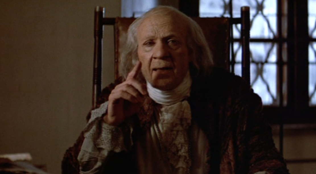 Het korte filmfragment eindigt ermee dat de nog jonge Salieri ontroert en in vervoering voor Mozart’s bladmuziek staat, en opeens abrupt naar de bittere werkelijkheid wordt teruggetrokken door een getergde Mozart die op een onbehouwen manier de bladmuziek voor de neus van Salieri van de standaard weggrist en er gehaast vandoor gaat, Salieri geschokt en verbijsterd achterlatend.